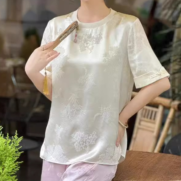 قميص حريري على شكل تاج من الكريب والجاكار مزين بزهرة الجاكار وياقة مستديرة مع زخرفة معدنية على الطراز الوطني نصف كم