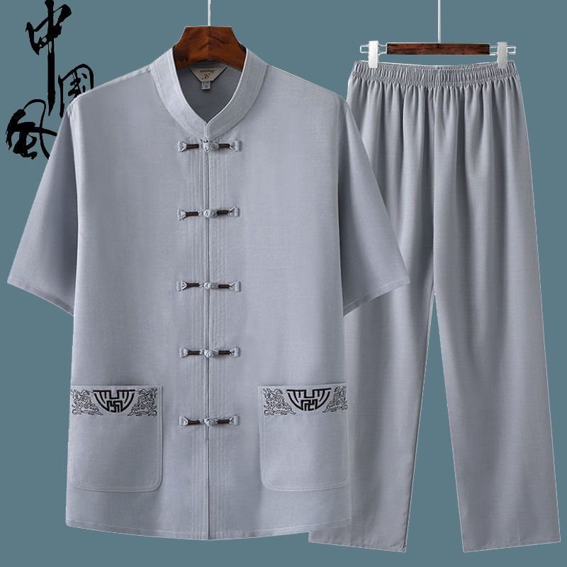 ملابس تاي تشي بدلة تانغ بأكمام قصيرة في منتصف العمر وكبار السن بدلة أبي نمط غير رسمي الجد الرجال هان شيا نمط الصباح ممارسة