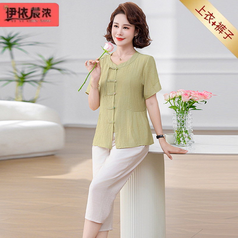 فستان صيفي للأم تبلغ من العمر 50 عامًا بدلة قميص على الطراز الوطني سترة من الكتان الرقيقة تي شيرت مكون من قطعتين قميص صغير للسيدات في منتصف العمر وكبار السن