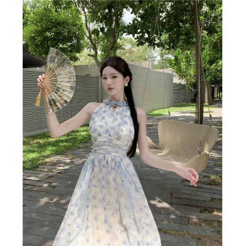 فستان شاطئ من الشيفون الفرنسي باللون الأزرق بدون أكتاف مع رقبة رسن