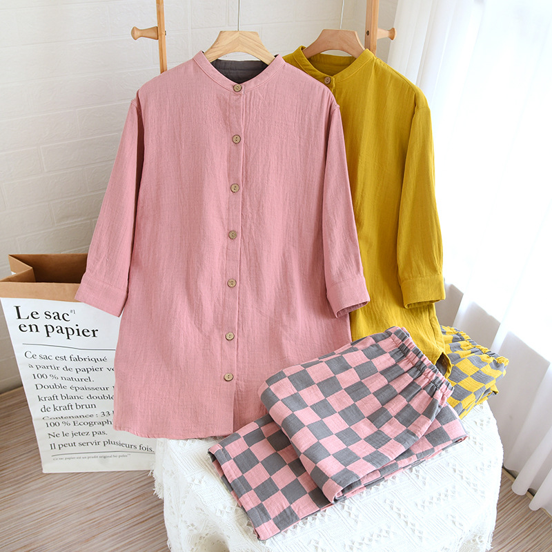 طقم بيجامات كريب نسائي صيفي رقيق مصنوع بالكامل من الكريب القطني ملابس منزلية مريحة تسمح بالتهوية وبنطلون بدلة منزلية