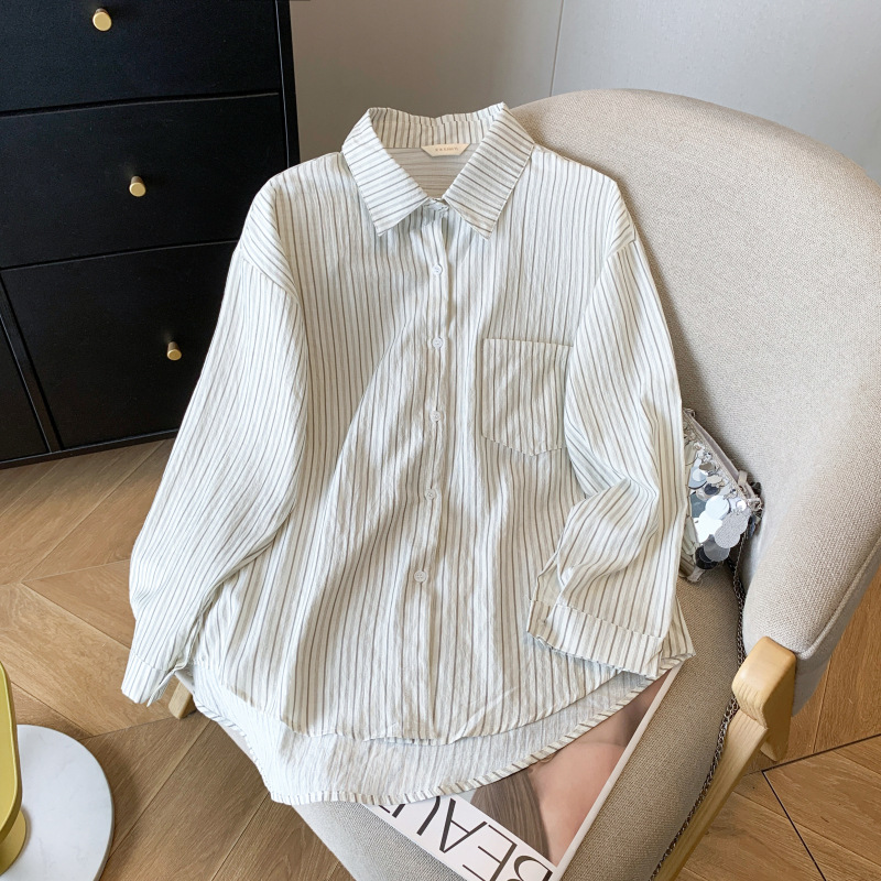 لقطة حقيقية في المخزون قميص نسائي صيفي جديد رقيق وفضفاض وواقي من الشمس وأكمام طويلة مخطط وواقي من الشمس