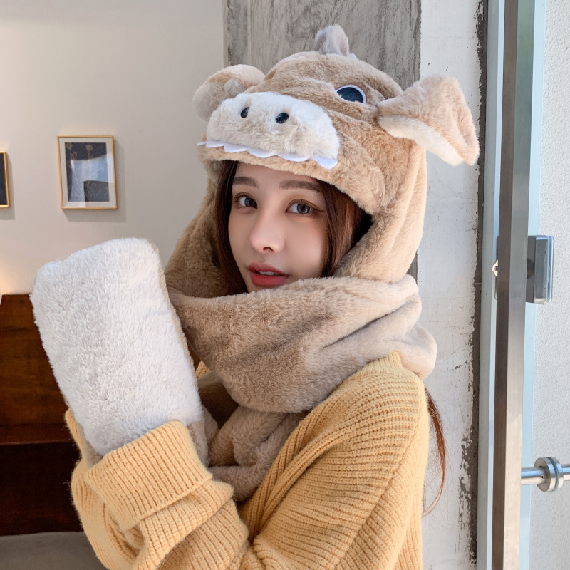 قفازات وشاح على شكل قبعة كرتونية قطعة واحدة للنساء شتاء دافئ ثلاث قطع سميكة مبطنة بالصوف وشاح لطيف يجعل الوجه يبدو صغيرًا