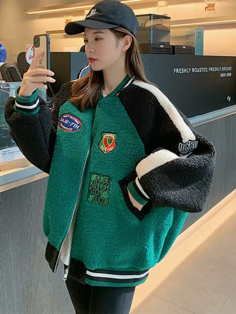 مجموعة خارجية من شعر الحمل للسيدات محطة أوروبية لخريف وشتاء 2024 سترة بيسبول قصيرة ومخملية سميكة وسميكة