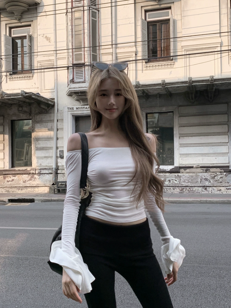 تي شيرت صيفي رقيق بأكمام طويلة مكشوف الأكتاف ومطوي