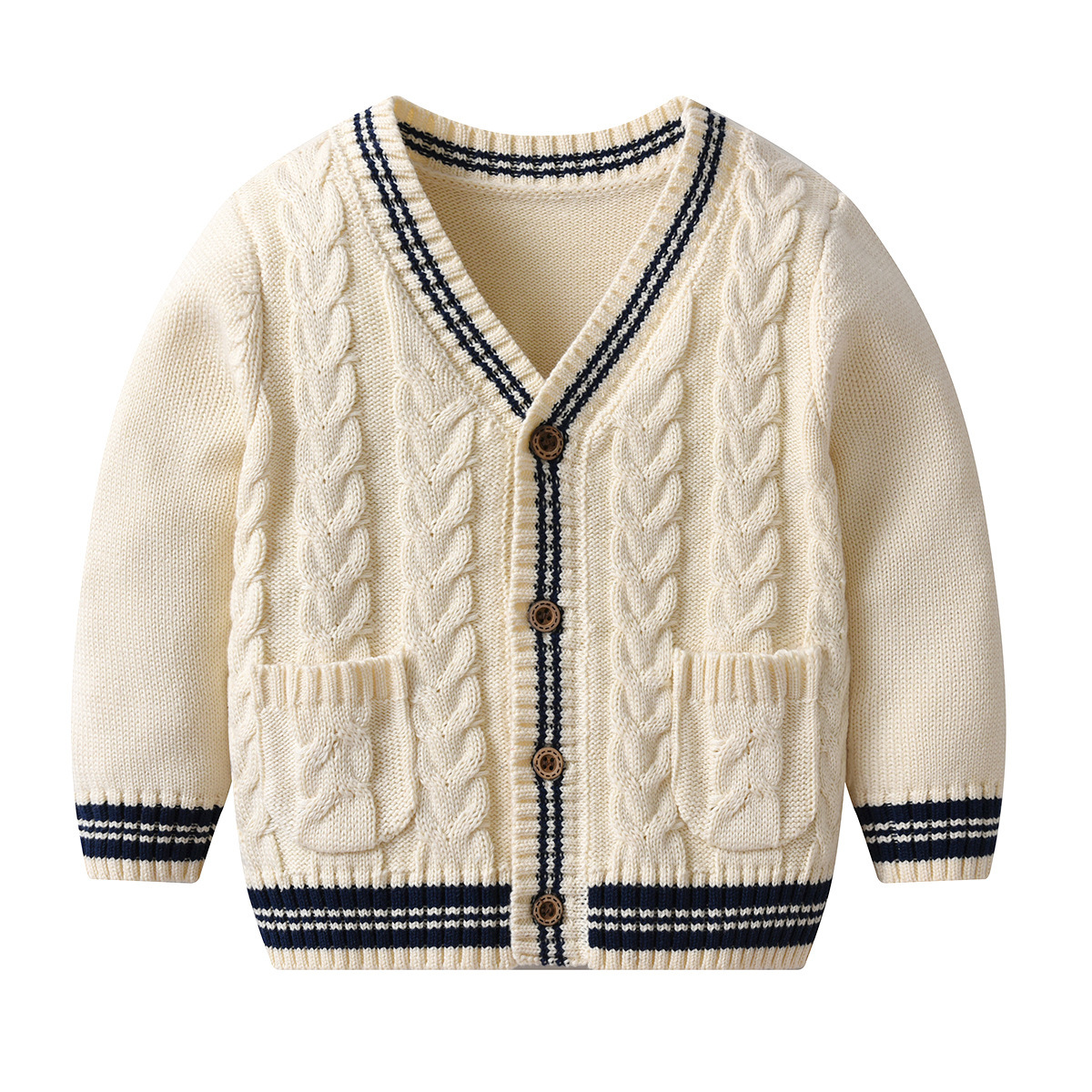 سترة للأولاد للربيع والخريف، سترة محبوكة جديدة على الطراز الكوري برقبة على شكل حرف V وجيب ملتوي، سترة علوية من القطن للأطفال