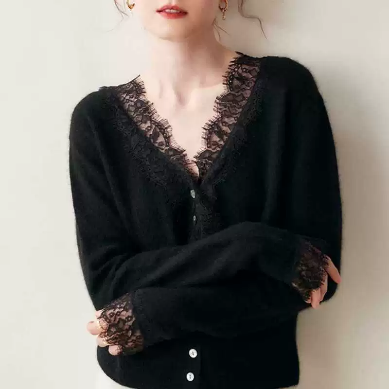 سترة فضفاضة من الكشمير الخالص برقبة على شكل حرف V من الدانتيل
