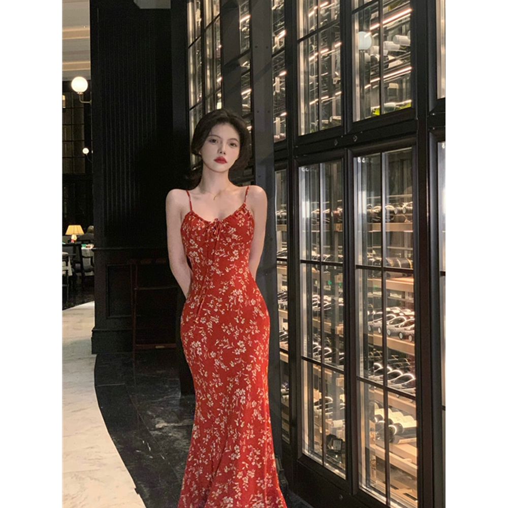 فستان أحمر صيفي بحزام حمالة زهور على الطراز القديم