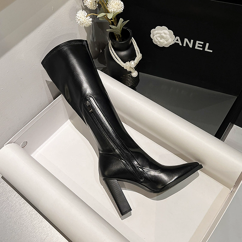 رأس الخريف والشتاء مربع رفيع وعالي الحذاء الأسود الطويل