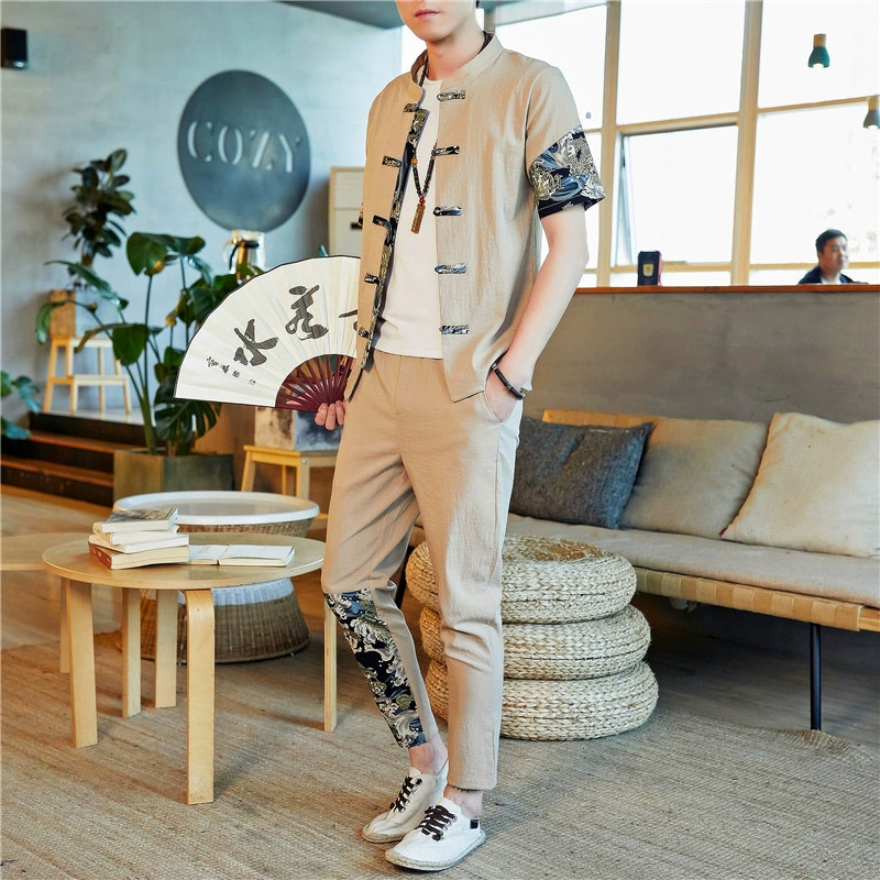بدلة صيفية من القطن والكتان بأكمام قصيرة للرجال، كارديجان بدلة تانغ على الطراز الصيني، مشبك هانفو، ياقة واقفة من الحرير الجليدي على الطراز القديم، اتجاه بدلة التونيك الصينية