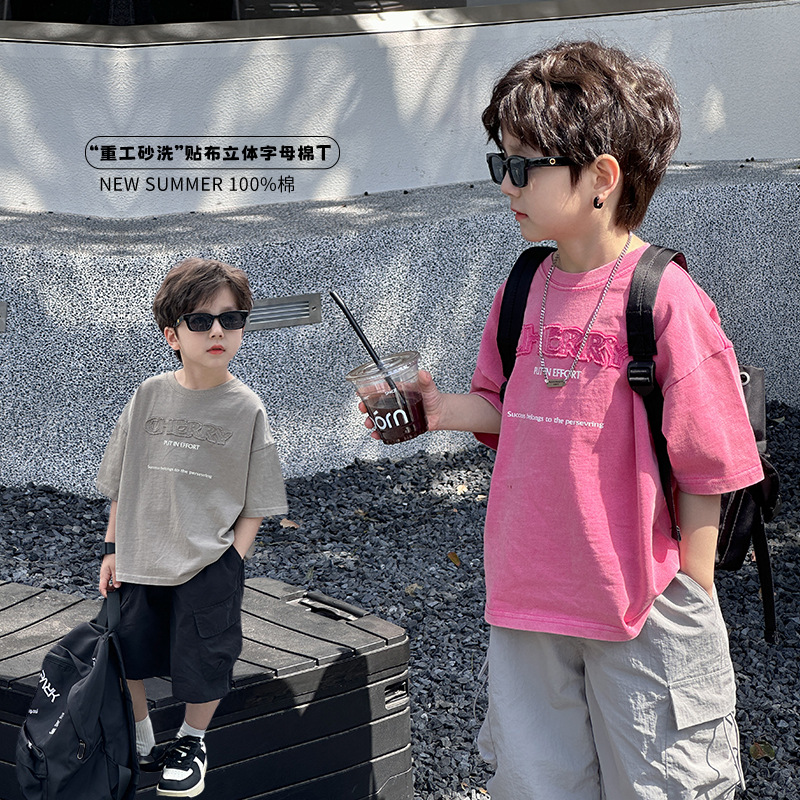 [3.28 يوم رجال الأعمال 200-20 قبل ساعة واحدة من البريد] تي شيرت وسيم قصير الأكمام للأطفال برقعة غسيل الرمال