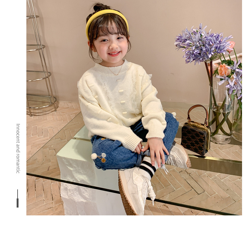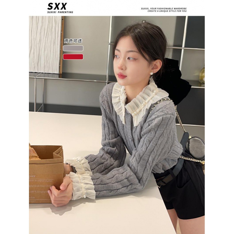سترة صوفية محبوكة جديدة لربيع 2024 بأكمام طويلة وياقة من الدانتيل للفتيات