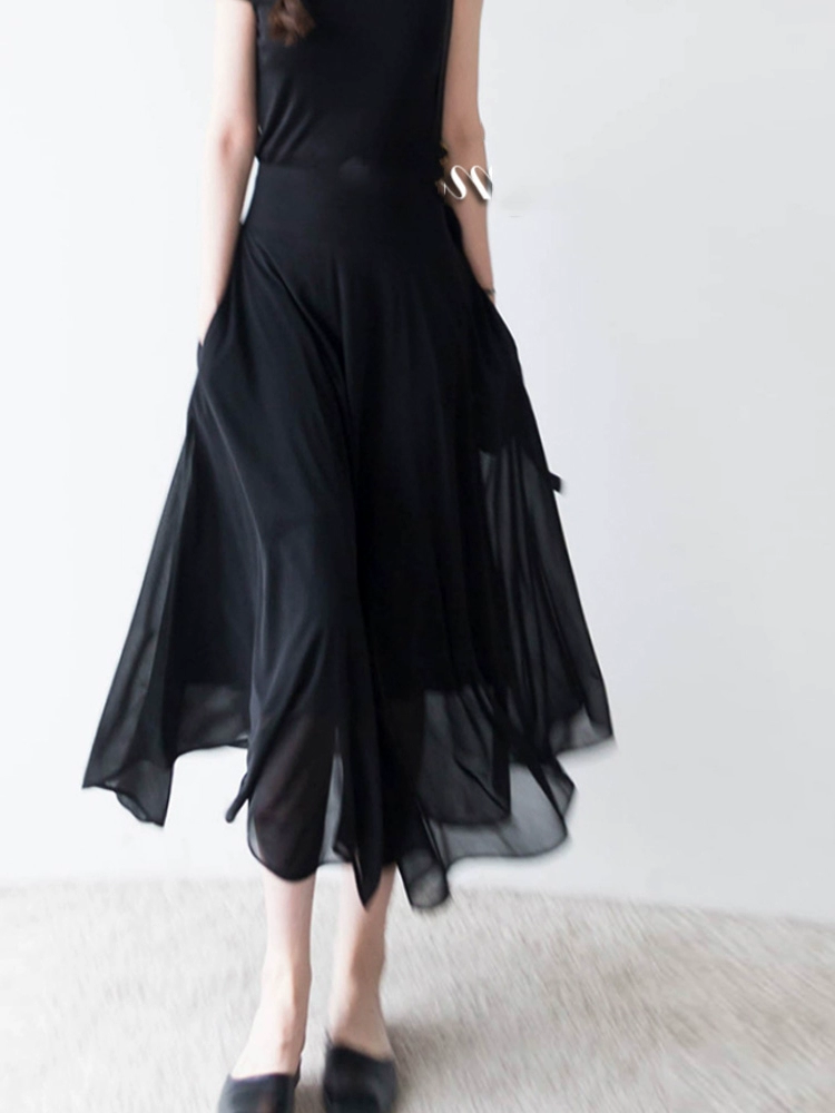 تنورة شيفون سوداء سبيكة للنساء مع عالي الخصر أرفلي الطول في منتصف الطول والخريف النحيف للتنورة الطويلة متعددة الاستخدامات