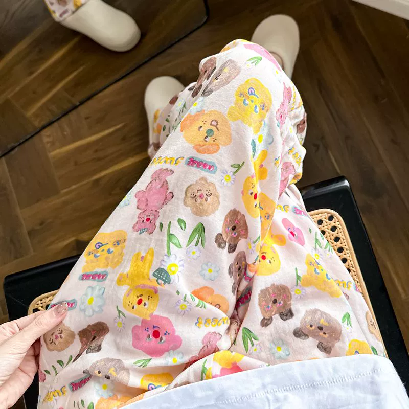 يمكن أن ترتدي بيجامات الإقرارات الحلوة اليابانية ، الربيع والصيف ، شاش القطن النقي ، الحجم الكبير الرفيع ، بنطلون شاش من القطن الثانوي