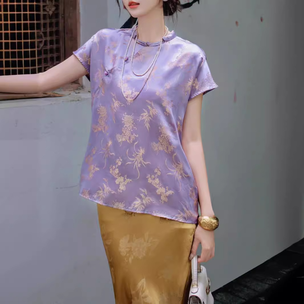 جديد الصينية الحرير الأرجواني زهرة النمط الوطني الصغيرة العمودي طوق مشبك واحدة الصدر أنيقة الصيف قصيرة الأكمام تانغ الأعلى