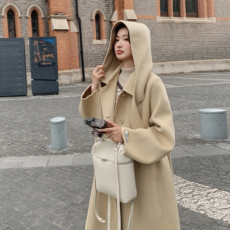 تصميم لقطة حقيقية معطف من الكشمير بقلنسوة على الوجهين للنساء متوسط الطول لخريف وشتاء 2024 معطف صوفي بنمط هيبورن الجديد