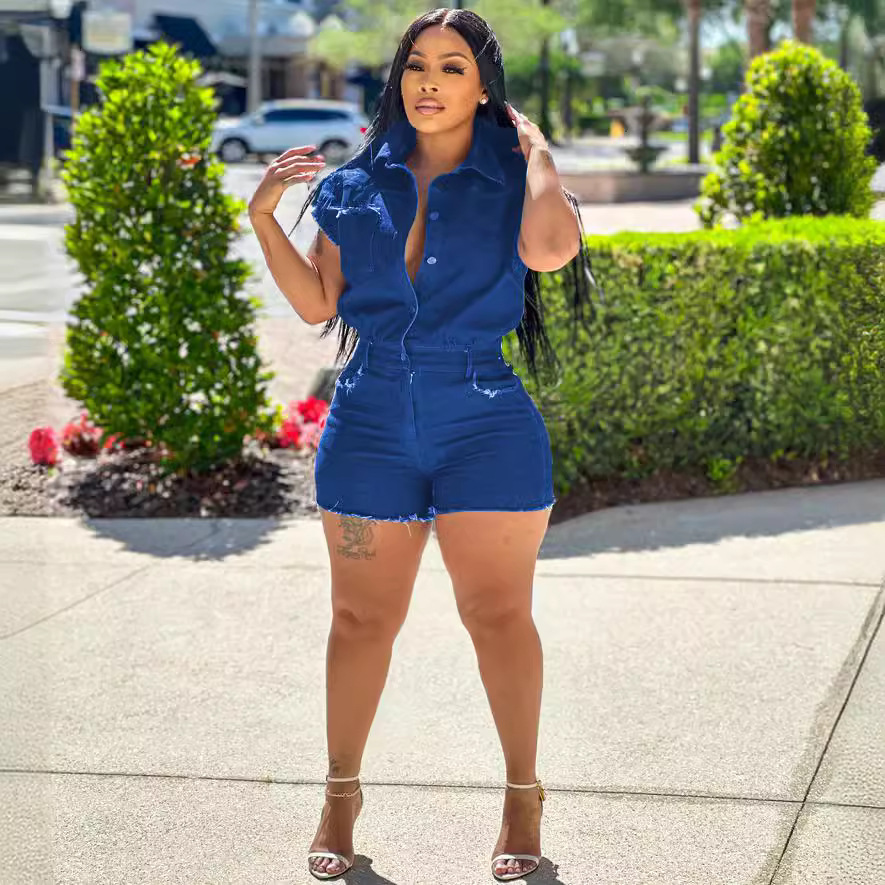 بذلة نسائية أوروبية وأمريكية بخصر مطاطي، بدلة قفز من قماش الدنيم قابلة للتمدد عبر الحدود للسيدات، صيفية للشارع
