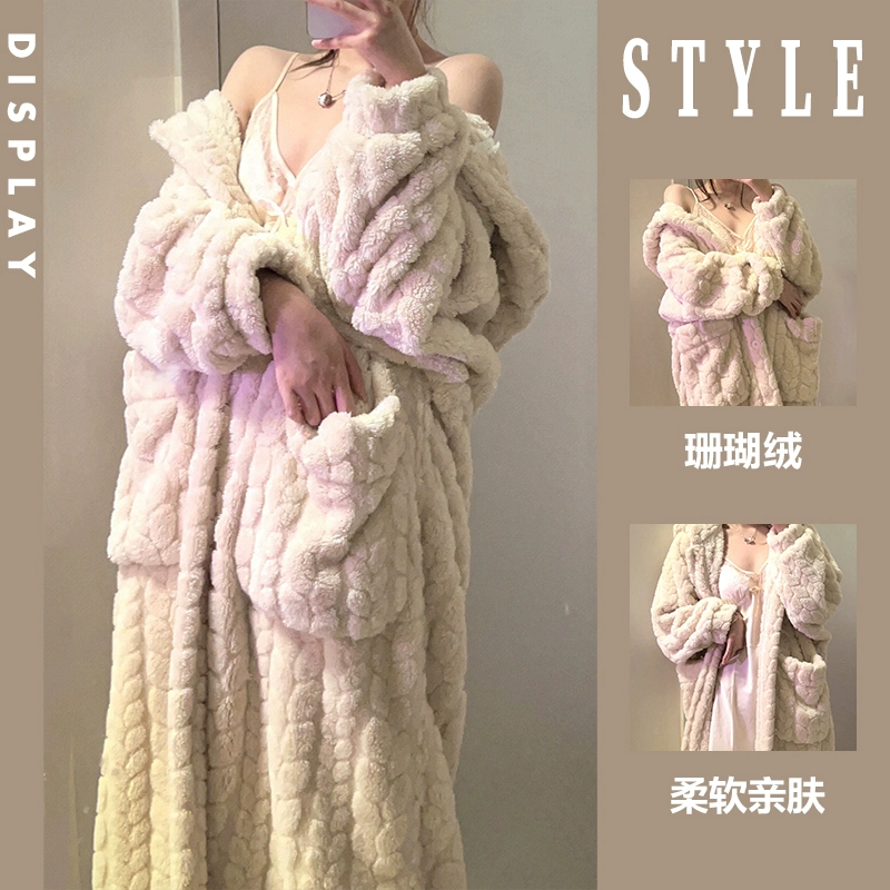 بيجامات مخملية المرجان الفرنسية المتطورة للنساء بالإضافة إلى مخملية وشتاء سميك كبير الحجم طويل الأطواق بطول ثوب نوم على غرار شهوة نقي