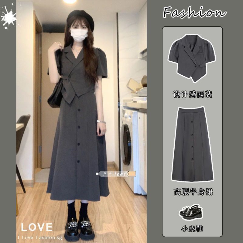 بدلة نسائية 2024 صيف جديد على طراز هونج كونج بدلة قصيرة غير منتظمة لطية صدر السترة تنورة عالية الخصر طقم مكون من قطعتين