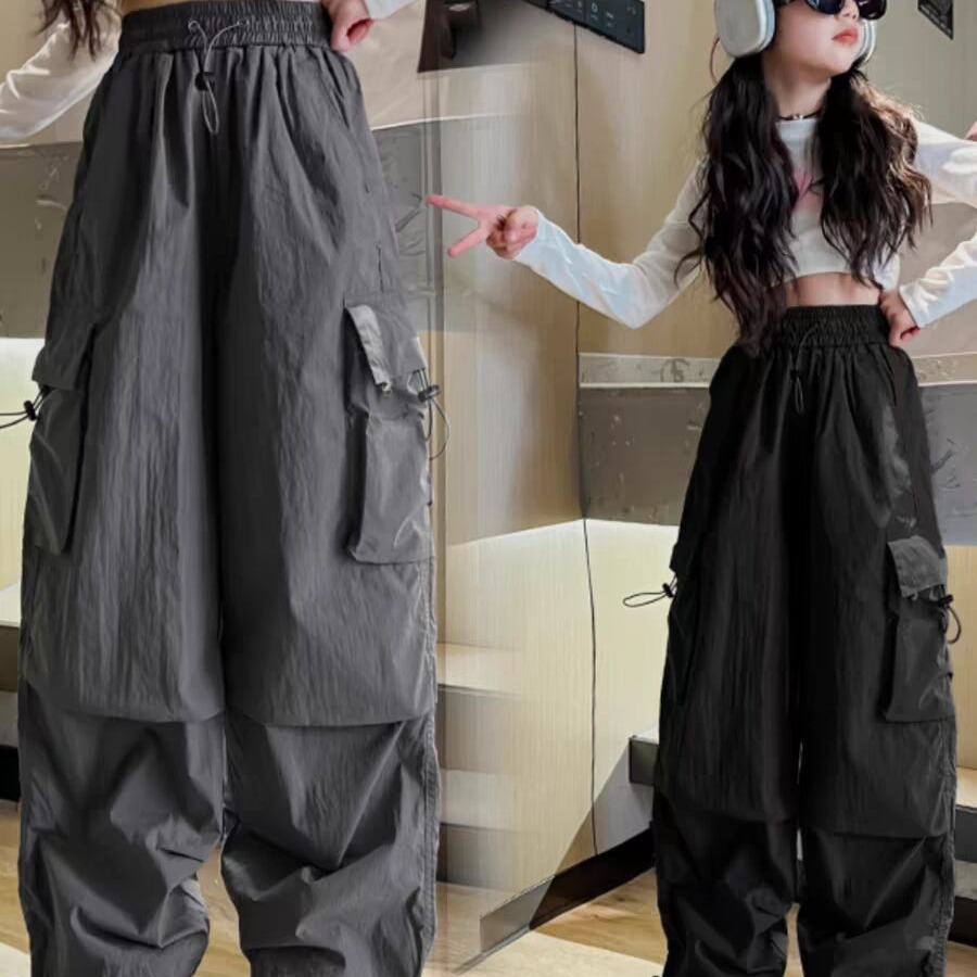 سروال بناتي للربيع والخريف أسود عصري رائع على الطراز الغربي للأطفال صيفي غير رسمي سروال مظلي سروال بناتي واسع الساق