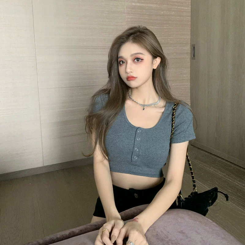 رغبة نقية فتاة الساخنة زر قصيرة الأكمام تي شيرت المرأة الصيف تصميم المتخصصة ضئيلة عالية الخصر قصيرة السرة الأعلى