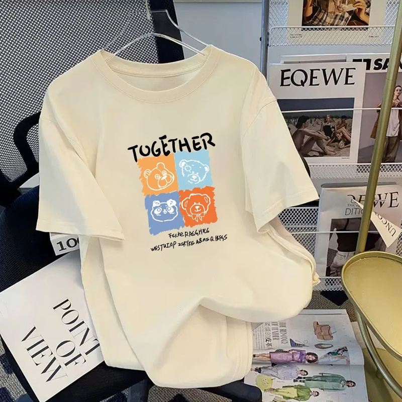 تي شيرت أبيض بتصميم رسوم متحركة صيفي فضفاض بأكمام قصيرة