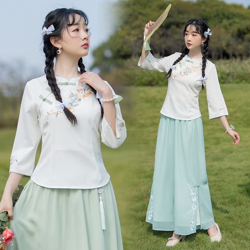 قميص بناتي كاجوال من الدانتيل بتصميم عبق جميل 2024 للربيع والخريف على الطراز الصيني قميص مكشكش على الطراز الوطني