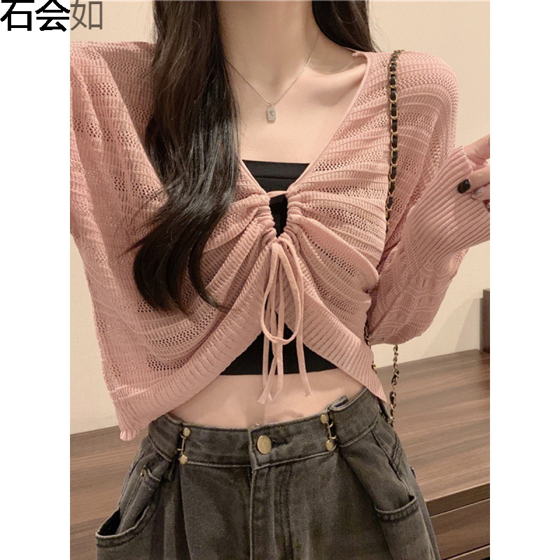 سترة واقية من الشمس محبوكة برباط مجوف في اتجاهين باللون الوردي للسيدات بلوزة خارجية ذات حزام صغير رفيع للصيف