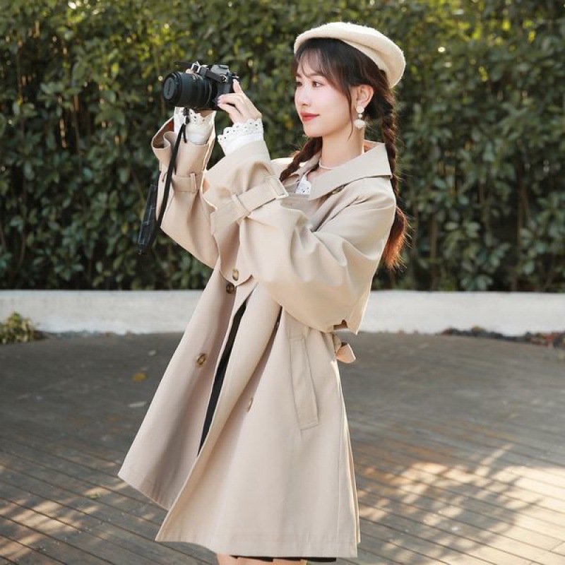 معطف كاكي متوسط الطول للنساء لربيع وخريف 2023 معطف ياباني صغير رقيق غير رسمي أنيق
