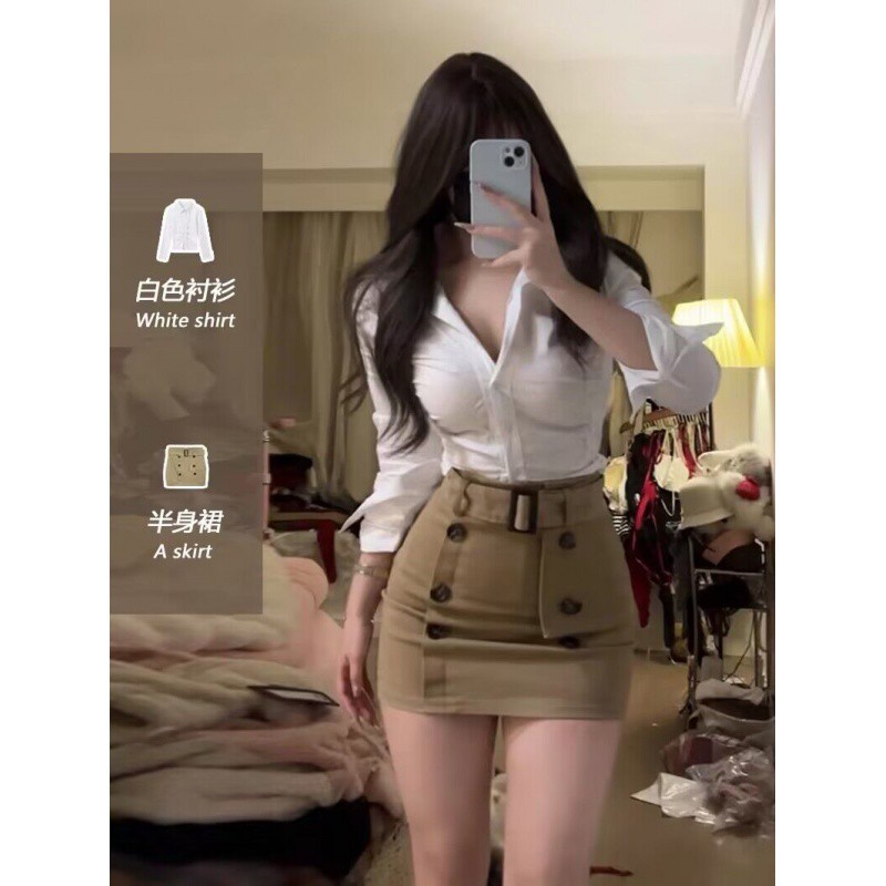 الرغبة النقية للرياح بدلة فتاة مثيرة 2024 ربيع جديد قاعدة تنحيف الخصر قميص طويل الأكمام بدلة تنورة عالية الخصر