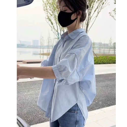 بدلة نسائية من قطعتين على الطراز الياباني، تصميم لطيف، تصميم متخصص، ناعم، أزرق حليبي، فضفاض، غير رسمي، واقي من الشمس، قميص علوي للصيف
