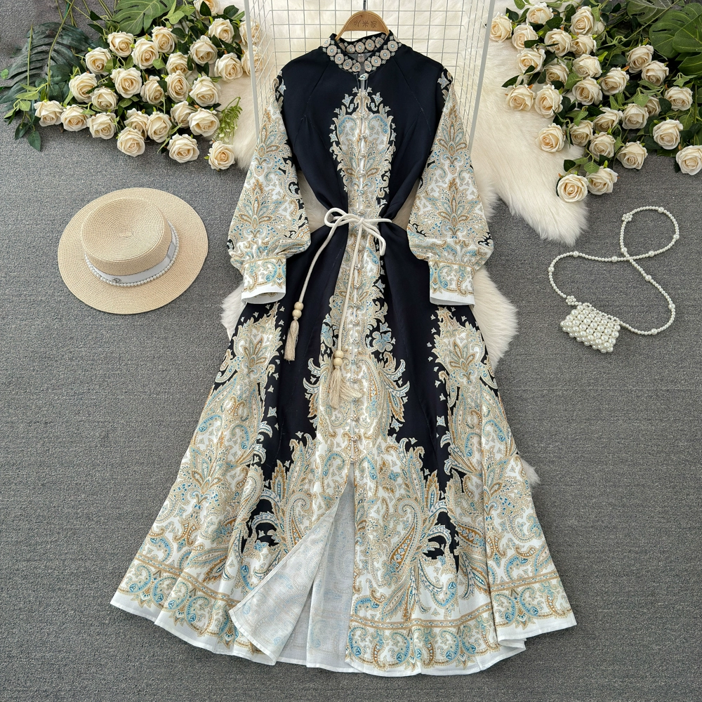 الربيع والخريف نمط القصر الرجعية بأكمام طويلة الوقوف طوق الخصر التخسيس واحدة الصدر ألف خط تحديد المواقع فستان مُزين بطباعة