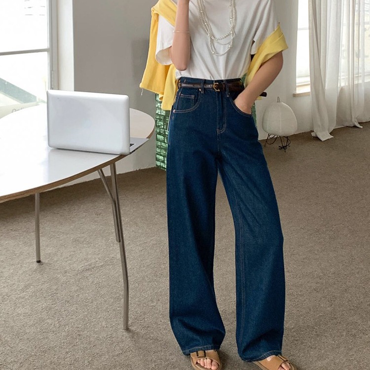 الراقية الجينز الفرنسي المرأة ربيع جديد أنيق الأزرق عارضة واسعة الساق السراويل فضفاضة السراويل الطويلة المستقيمة