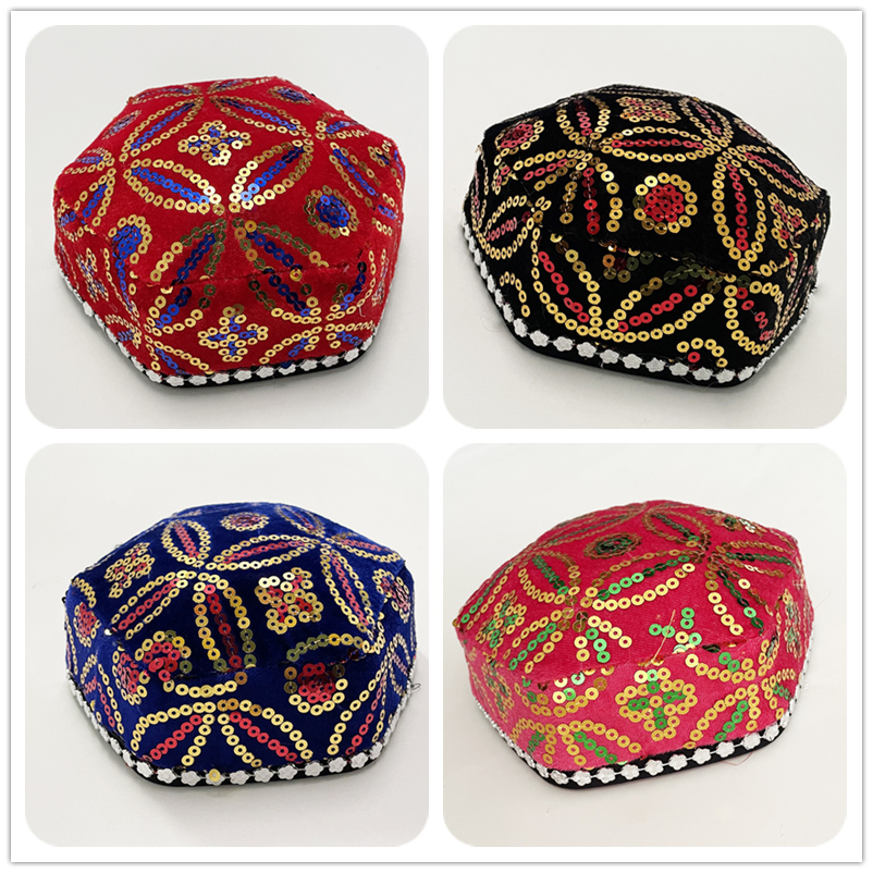 شينجيانغ مسدس قبعة مع جديلة الرجال والنساء قبعة أداء أغطية الرأس الويغور الرقص الأطفال قبعة على شكل زهرة صغيرة قبعة العرقية