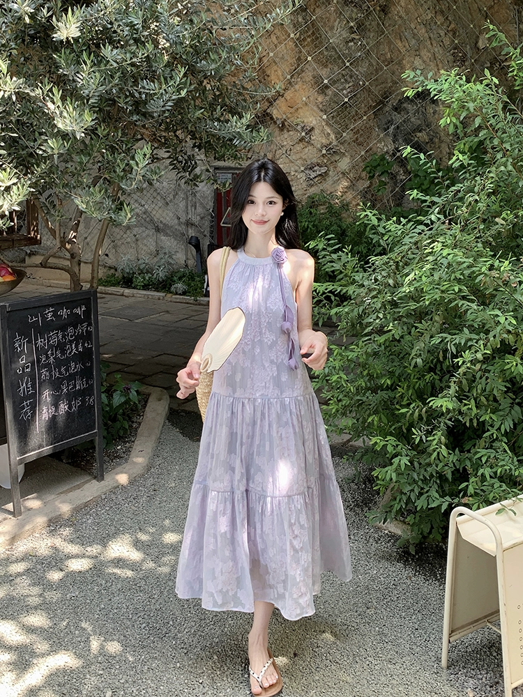 فستان أرجواني خرافي لعطلة شاطئ البحر في الصيف والزهور