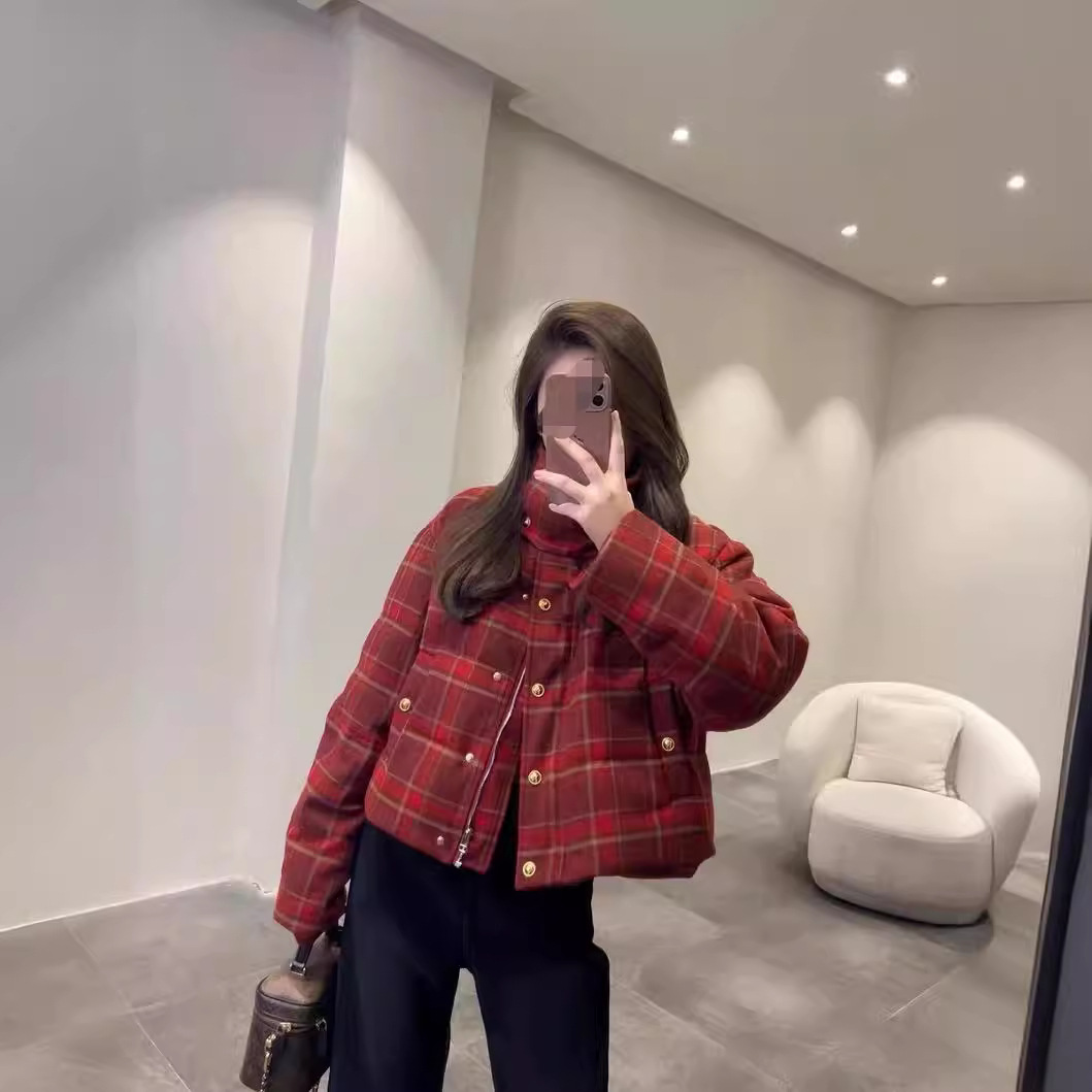 Xiaoxiang نمط الحد من العمر خمر الصينية الأحمر منقوشة أسفل سترة المرأة الشتاء قصيرة العمودي طوق الأبيض بطة أسفل معطف الخبز
