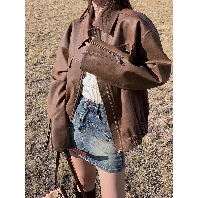 سترة جلدية نسائية 2024 جديدة للربيع والخريف سترة بنية قصيرة طراز ميلارد بني