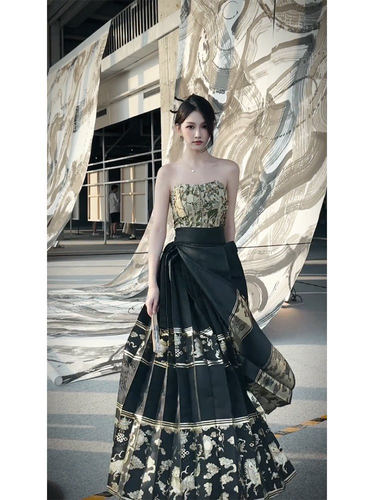 بلوزة نسائية صينية جديدة بدون حمالات مع تنورة على شكل وجه الحصان بدلة على الطراز الوطني صغيرة محسنة Hanfu 2024 صيف جديد
