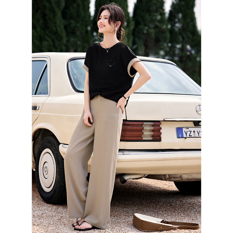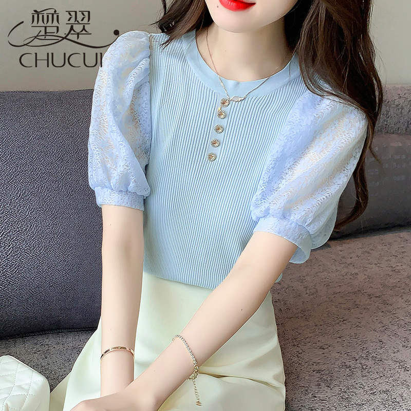 تي شيرت نسائي بأكمام قصيرة وخياطة علوية من الدانتيل وأكمام فانوس تي شيرت نسائي صيفي جديد أنيق وجميل لعام 2024