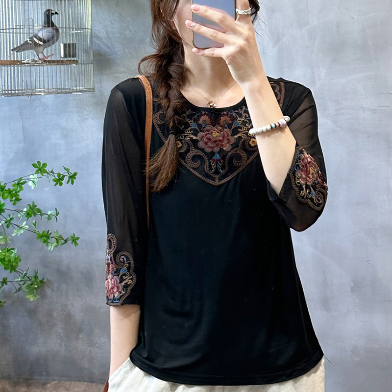 2024 الصيف بلون العرقية نمط قميص صغير مع القرن كم خفيفة الوزن الشاش كم مطرزة المرأة النمط الوطني قاعدة قميص