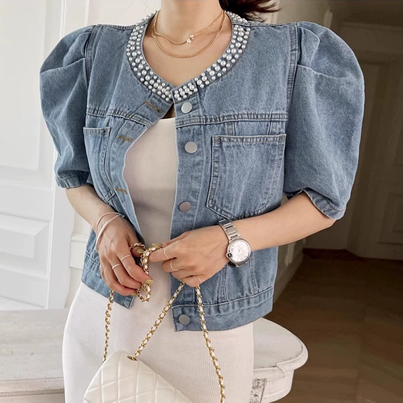 سترة كورية أنيقة بتصميم عتيق ورقبة دائرية ومزينة بالخرز، فضفاضة ومتعددة الاستخدامات، بأكمام قصيرة منتفخة من الدنيم للنساء