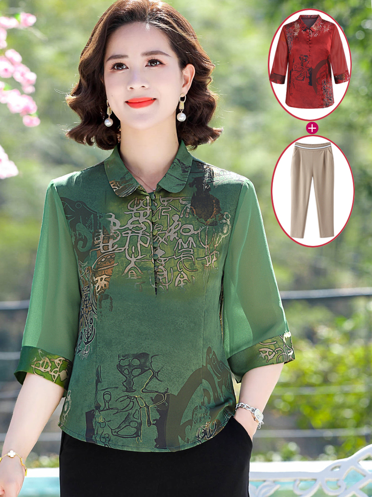 بدلة الأم في منتصف العمر للربيع والخريف على الطراز الأجنبي للنساء في منتصف العمر وكبار السن قميص شيفون صغير صيفي غير رسمي ملابس مزاجية طقم مكون من قطعتين