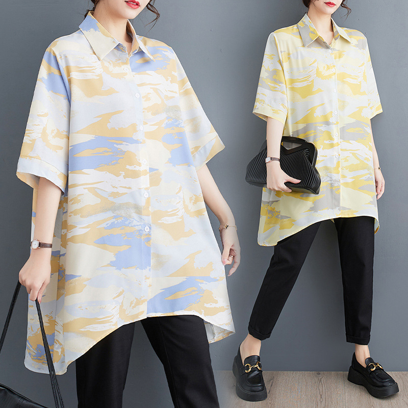 2023 صيف جديد نمط فضفاض عادية متعددة الاستخدامات غير النظامية طباعة وصباغة قميص كبير الحجم تي شيرتات قصيرة الاكمام للفتيات ممتلئ الجسم