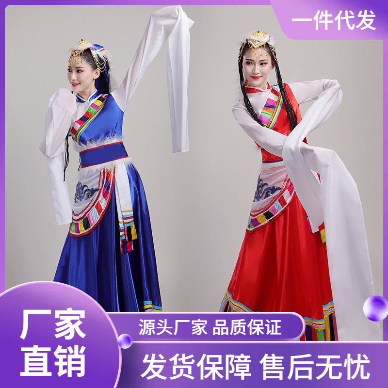 ملابس أداء الرقص التبتية الجديدة الأقلية العرقية التبتية كم الماء فستان طويل ملابس الرقص المربعة أداء الإناث البالغات