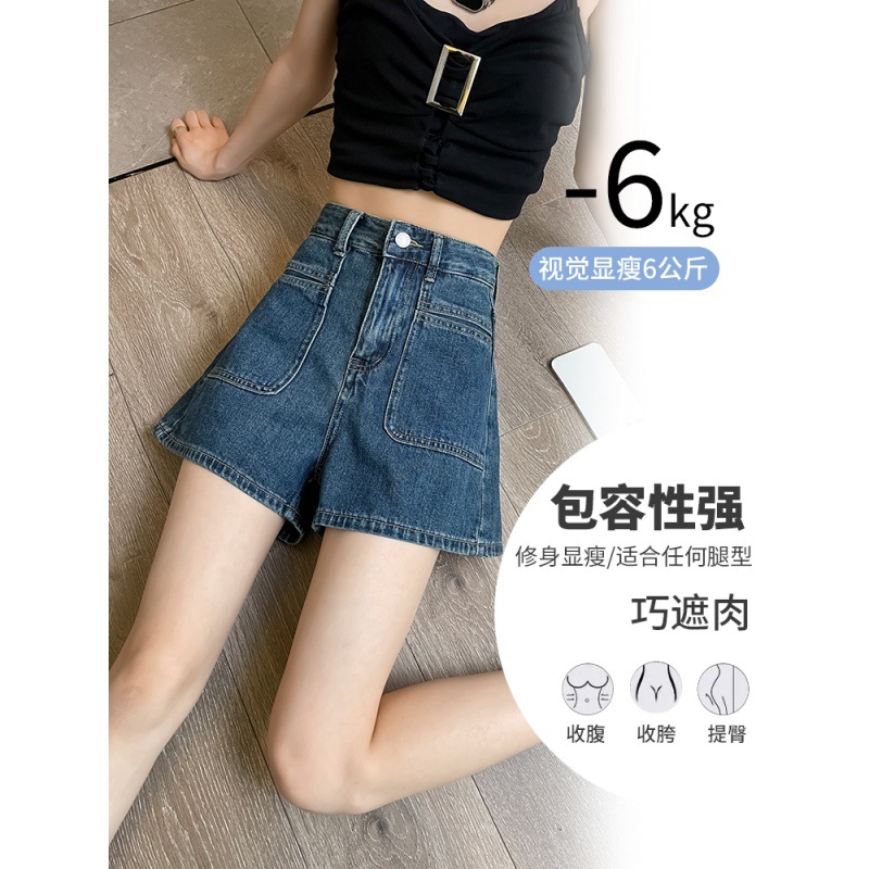 الأزرق الداكن الدنيم السراويل النسائية الصيف رقيقة عالية الخصر جيب كبير مستقيم فضفاض التخسيس ألف خط تغطي اللحوم السراويل الصغيرة الساخنة