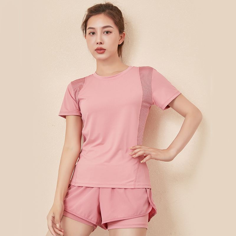 ملابس يوغا صيفية رفيعة ومضادة للضوء بدلة رياضية نسائية غير رسمية شبكية قابلة للتنفس بأكمام قصيرة طقم مكون من قطعتين