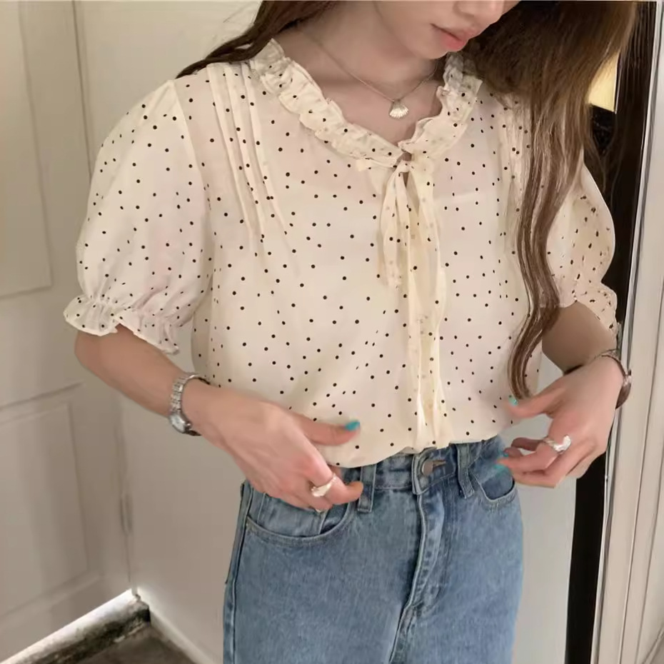 لقطة حقيقية 2024 صيف جديد الكورية نمط بسيط الحلو الأذن الخامس الرقبة التعادل Polpoint قصيرة الأكمام قميص أعلى