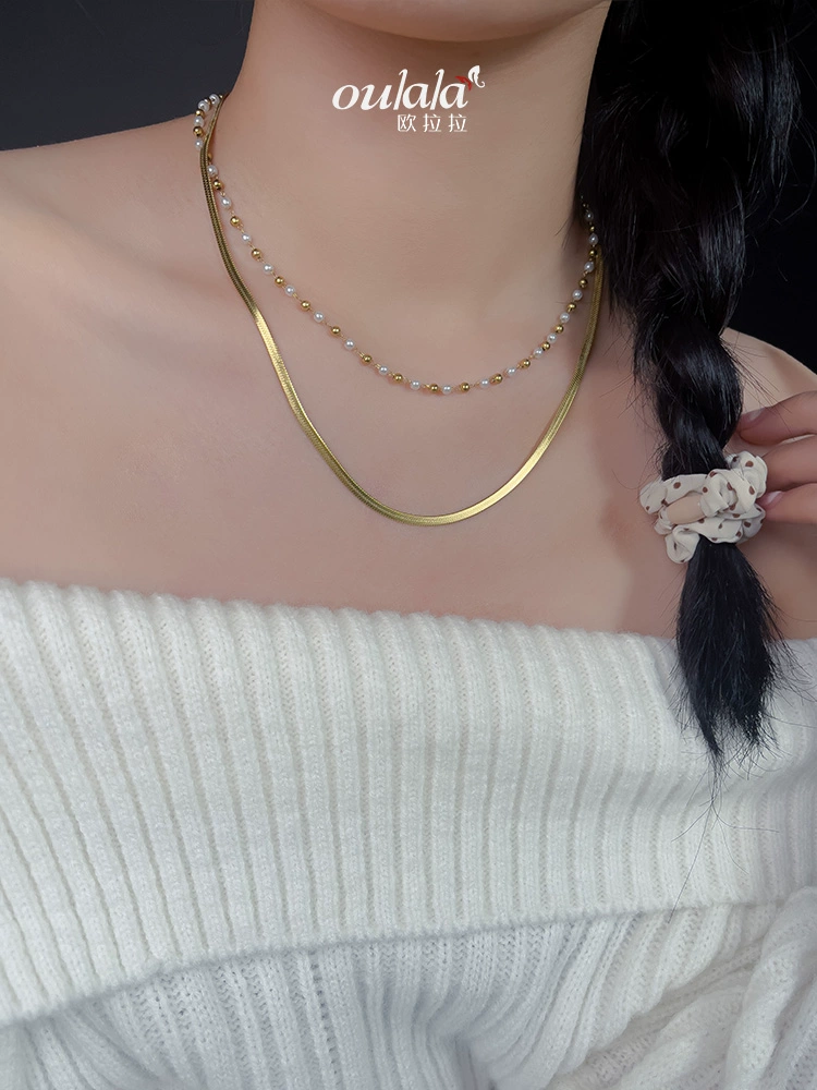 قلادة بسلسلة مسطحة من اللؤلؤ الفاخر الخفيف بطبقة مزدوجة من الفولاذ التيتانيوم سلسلة ترقوة غير باهتة لخريف وشتاء جديد 2023 مجوهرات جديدة