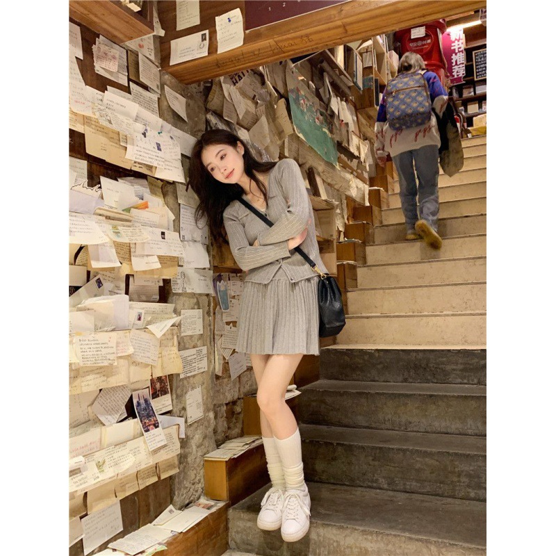 ربيع جديد نمط سلسلة الشاي الصغيرة ارتداء رمادي محبوك أعلى مطوي تنورة قصيرة رغبة نقية الرياح الحلو حار بدلة من قطعتين