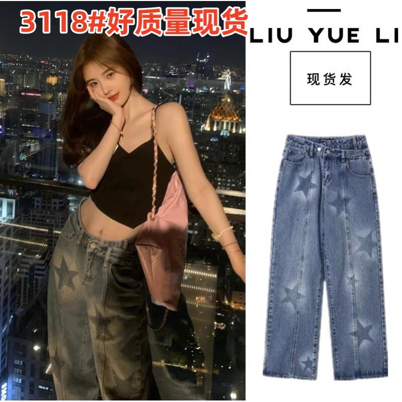 بنطلون جينز Ju Jingyi ذو النمط الكلاسيكي ذو النجمة الزرقاء للنساء بخصر عالٍ ومظهر نحيف ومستقيم وفضفاض وواسع الساق